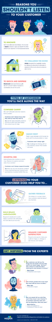 An Infographic by valpak demonstrates examples of entrepreneurs who succeeded despite initial feedback and provides scenarios of when it pays to listen to your customers and also when it may hold you back trying to please everyone.